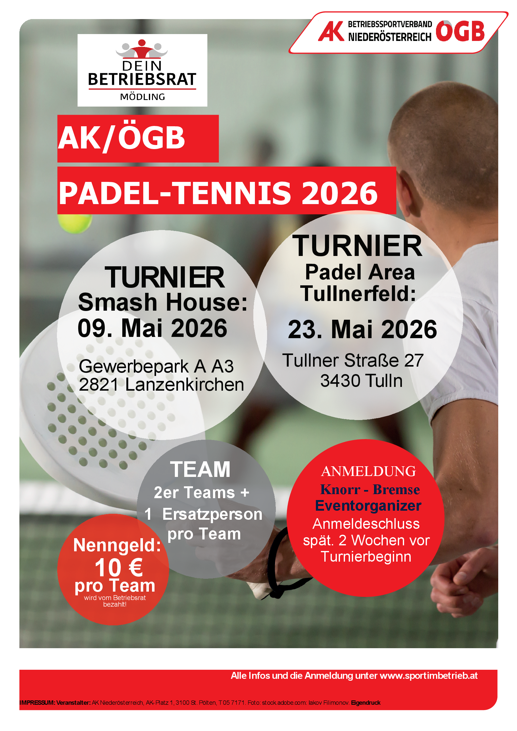Der AK/ÖGB Niederösterreich Padel-Tennis Cup steht vor der Tür – und wir wollen erneut als Standort Mödling (Knorr-Bremse & Zelisko GmbH) teilnehmen.
